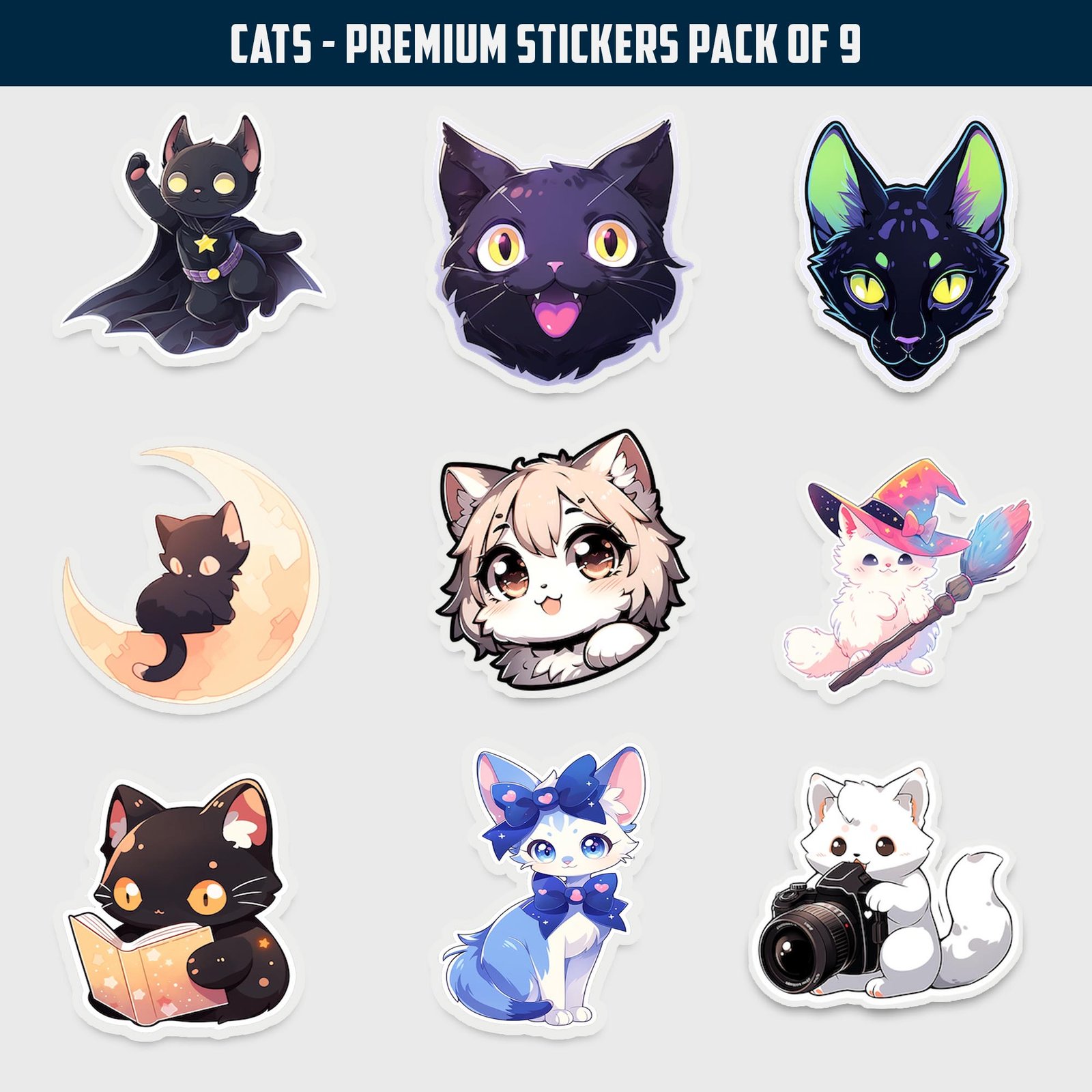 Don’t miss out on this unique opportunity to own a collection of high-quality cat stickers. Order your premium cat sticker pack of 9 today and transform your surroundings with the charm and elegance of these delightful feline designs.